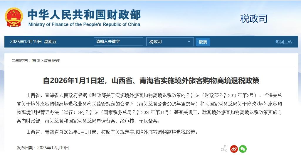 山西省、青海省人民政府根据《财政部关于实施境外旅客购物离境退税政策的公告》(财政部公告2015年第3号)、《海关总署关于境外旅客购物离境退税业务海关监管规定的公告》(海关总署公告2015年第25号)和《国家税务总局关于修改的公告》(国家税务总局公告2025年第11号)等有关规定,就其境外旅客购物离境退税政策实施方案向财政部、海关总署和国家税务总局申请备案,经审核,予以备案。